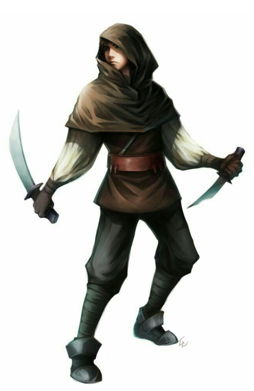 C’est la veille de son départ du village avec d’autres aventuriers qu’il passa à l’acte. Il se fit justice sur les coups de minuit car d’après lui « c’est plus mieux ». Il se dépêcha de rentrer chez lui pour nettoyer ses dagues pleines de sang, comme si ça lui permettait de laver sa conscience. Le sang sur les dagues rendait l’eau rose. Il déposa ses dagues au fond du sceau et regarda ses mains. Ça n’était plus les siennes mais celle d’un assassin, et la propreté des dagues n’y changeait rien. Depuis ce jour il combla la noirceur de ses actes par l’humour, car comme disait son père : « être heureux c’est voir le verre vide à moitié plein ».